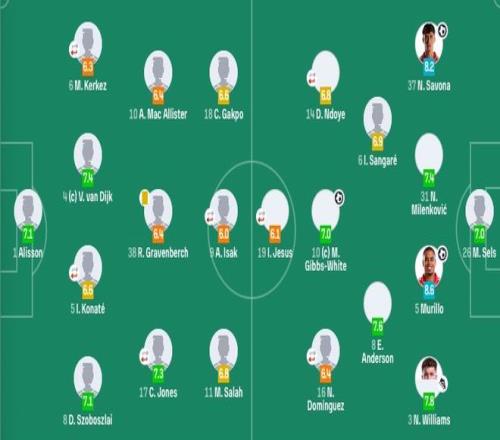 諾丁漢森林首發:26-澤爾斯、37-薩沃納、5-穆里略、3-內科-威廉姆斯、31-米倫科維奇、6-桑加雷、8-E-安德森、10-吉布斯-懷特、16-多明戈斯(61'21-哈欽森)、14-恩多耶(86'7-奧多伊)、19-伊戈爾-熱蘇斯(86'22-耶茨)