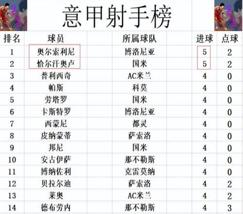 射手榜方面,意甲的射手們還是很低迷,奧爾索利尼和恰爾汗奧盧的5球都還是無人超過,他們還是并列第1。德布勞內,萊奧,勞塔羅,邦尼等12人4球并列第3。