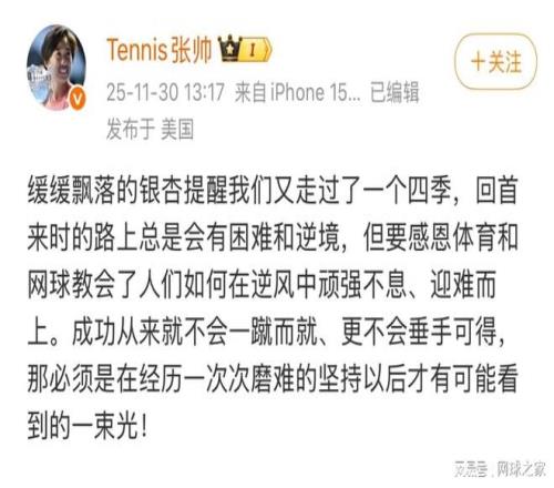 “感恩網球教會了如何在逆風中頑強不息、迎難而上。成功從來就不會一蹴而就、必須是在經歷一次次磨難的堅持以后才有可能看到的一束光!”張帥在兌現重返TOP100的承諾后,賽后通過個人社交媒體發布的這篇小作文將自己如何經歷逆境,以及最后逆風飛揚的原因予以了披露,內容情真意切十分感人,也讓外界再次看到了一個認真的張帥有多么可怕,似乎真的無所不能。