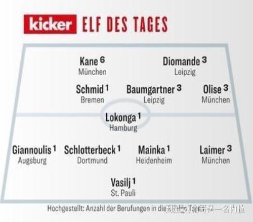 完成帽子戲法的拜仁慕尼黑前鋒凱恩本賽季第6次入選周最佳陣容,和利物浦、熱刺傳出緋聞的RB萊比錫天才攻擊手楊·迪奧曼德則第3次入選,前阿森納球員、目前效力于漢堡的比利時中場洛孔加也首次入圍。